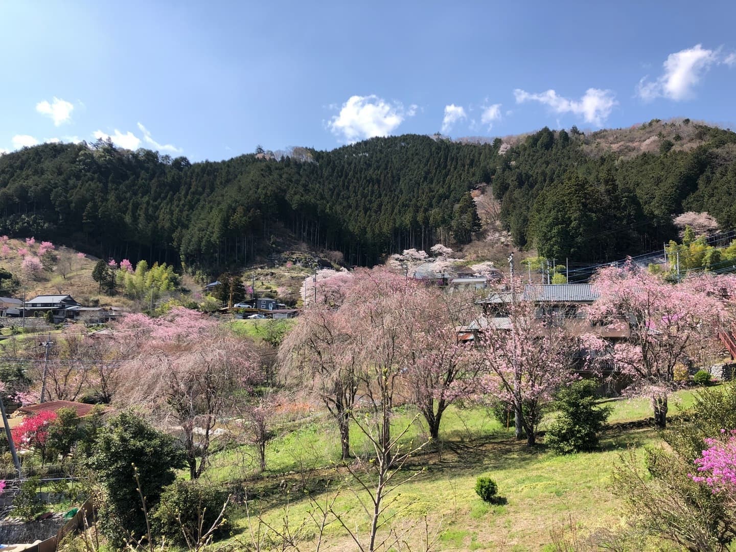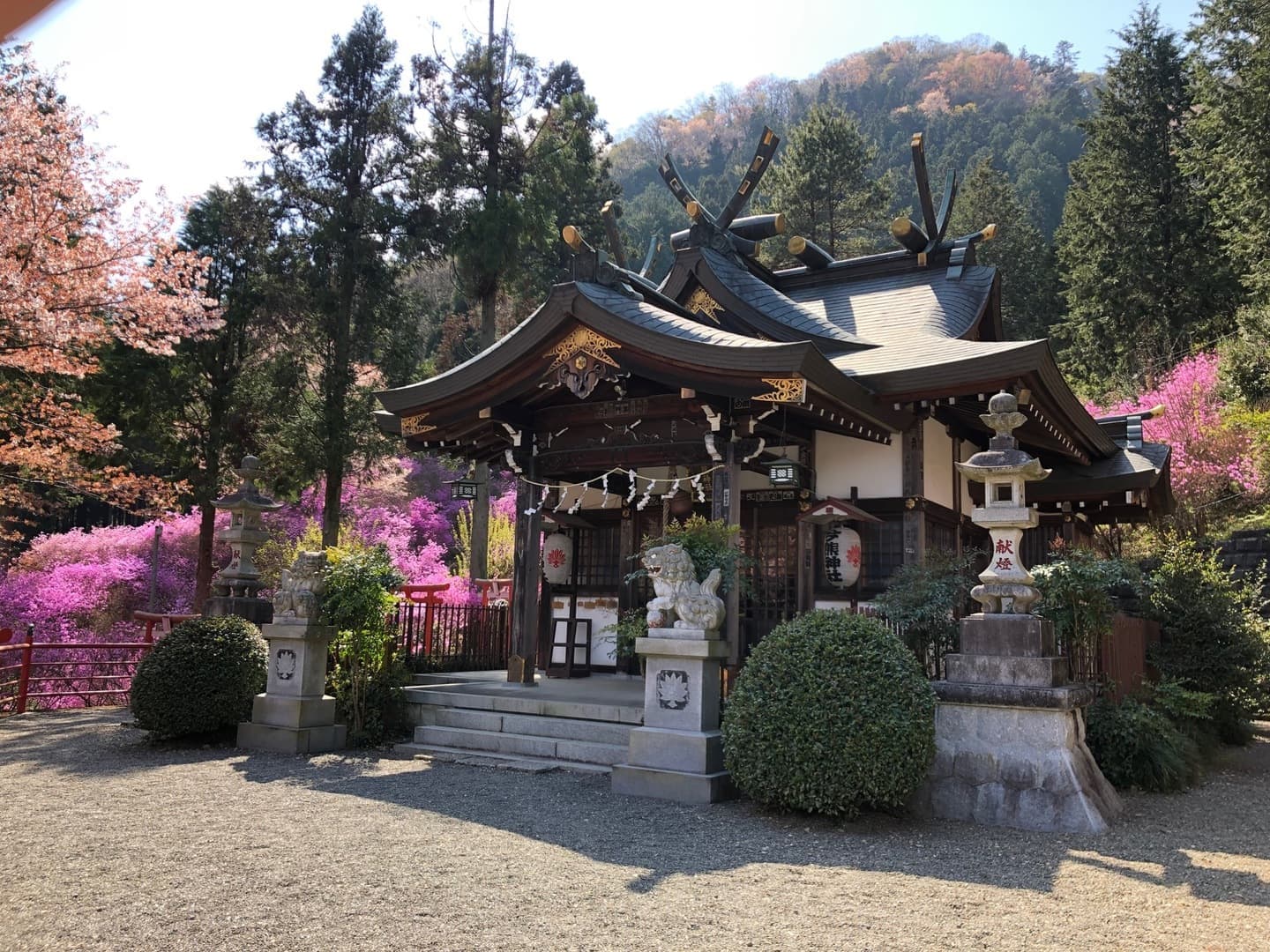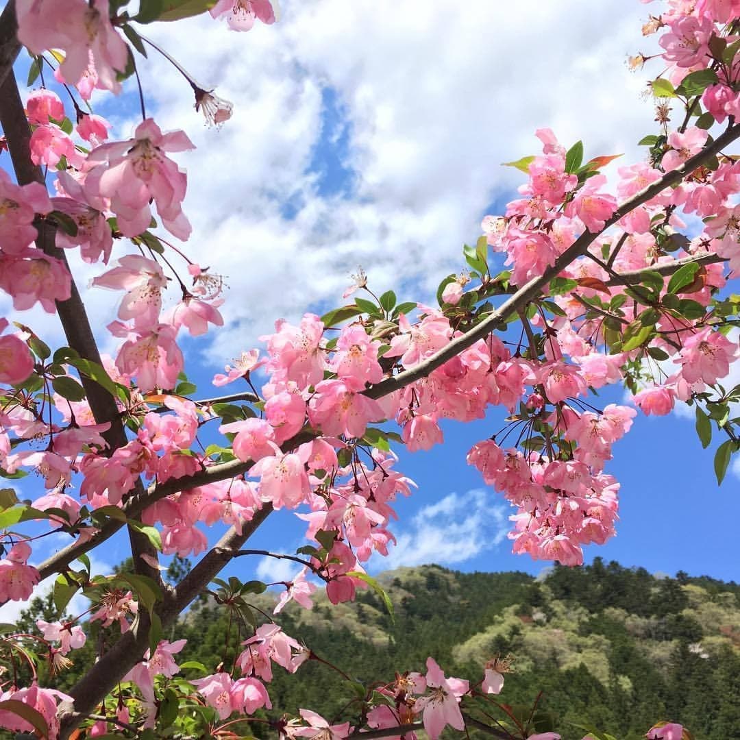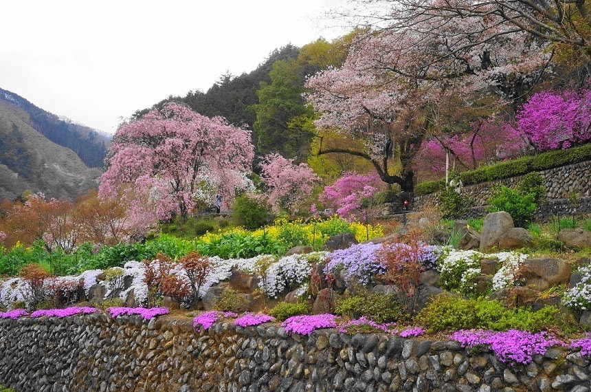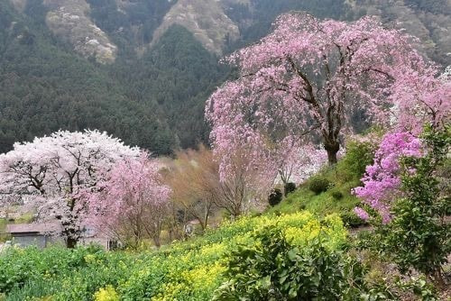 In spring, the mountains come alive with the soft pale pinks of wild cherry blossoms (Yamazakura) and the vivid pinks of azaleas (Tsutsuji), creating a breathtaking contrast against the fresh green of the valley.