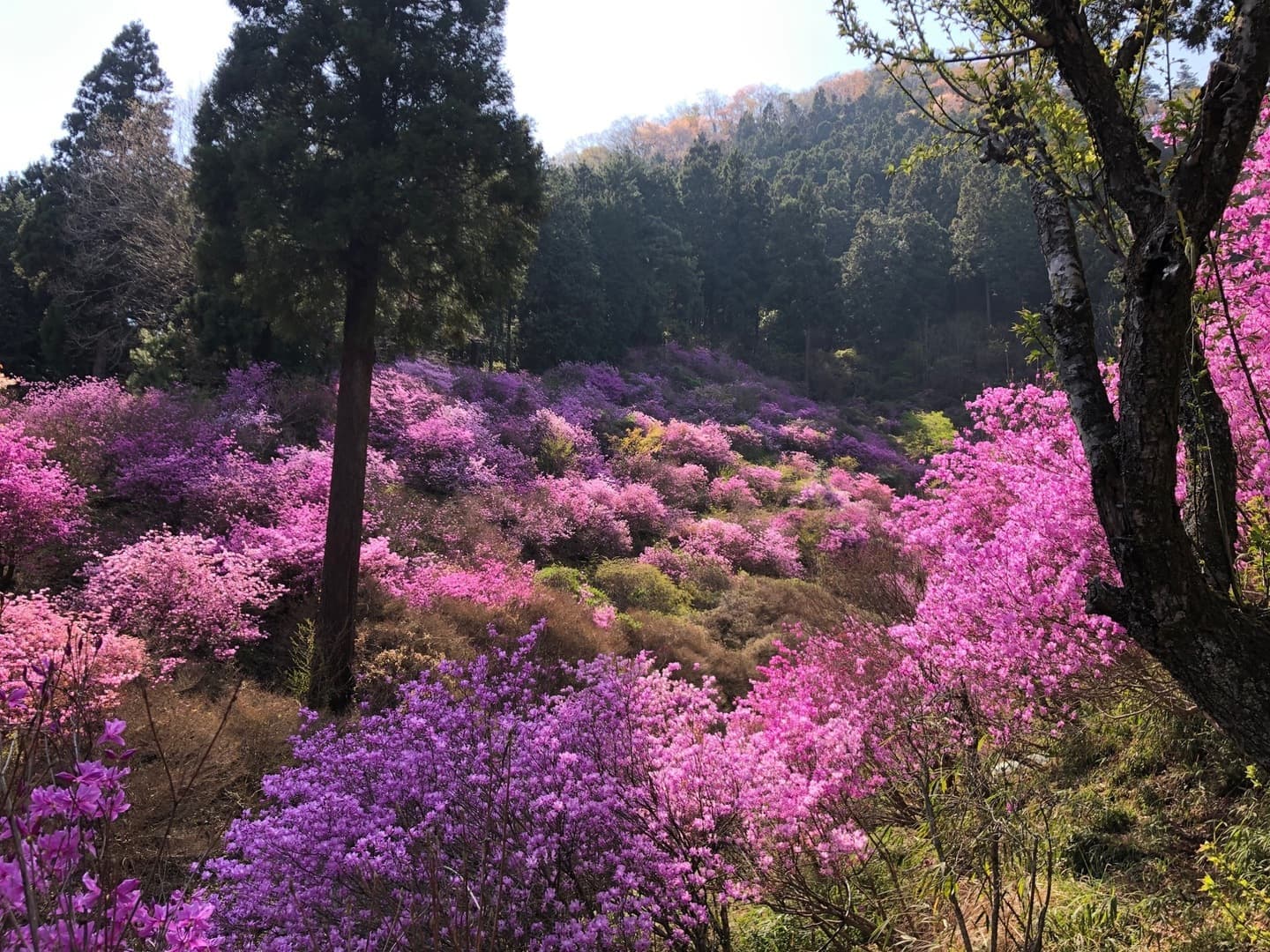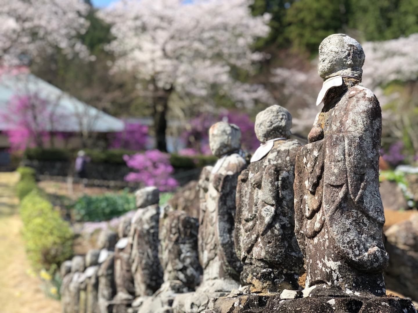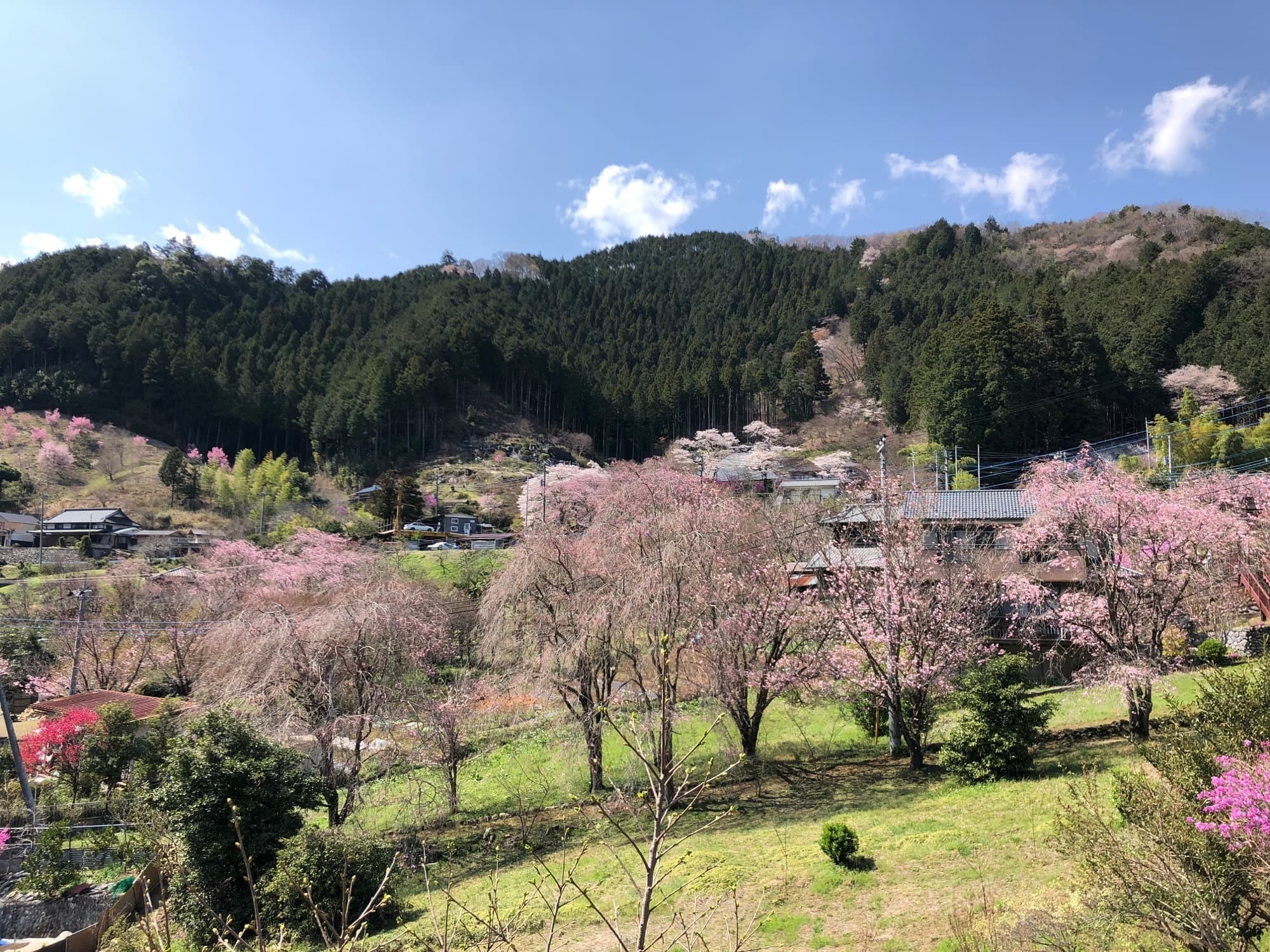 In spring, the mountains come alive with the soft pale pinks of wild cherry blossoms (Yamazakura) and the vivid pinks of azaleas (Tsutsuji), creating a breathtaking contrast against the fresh green of the valley.