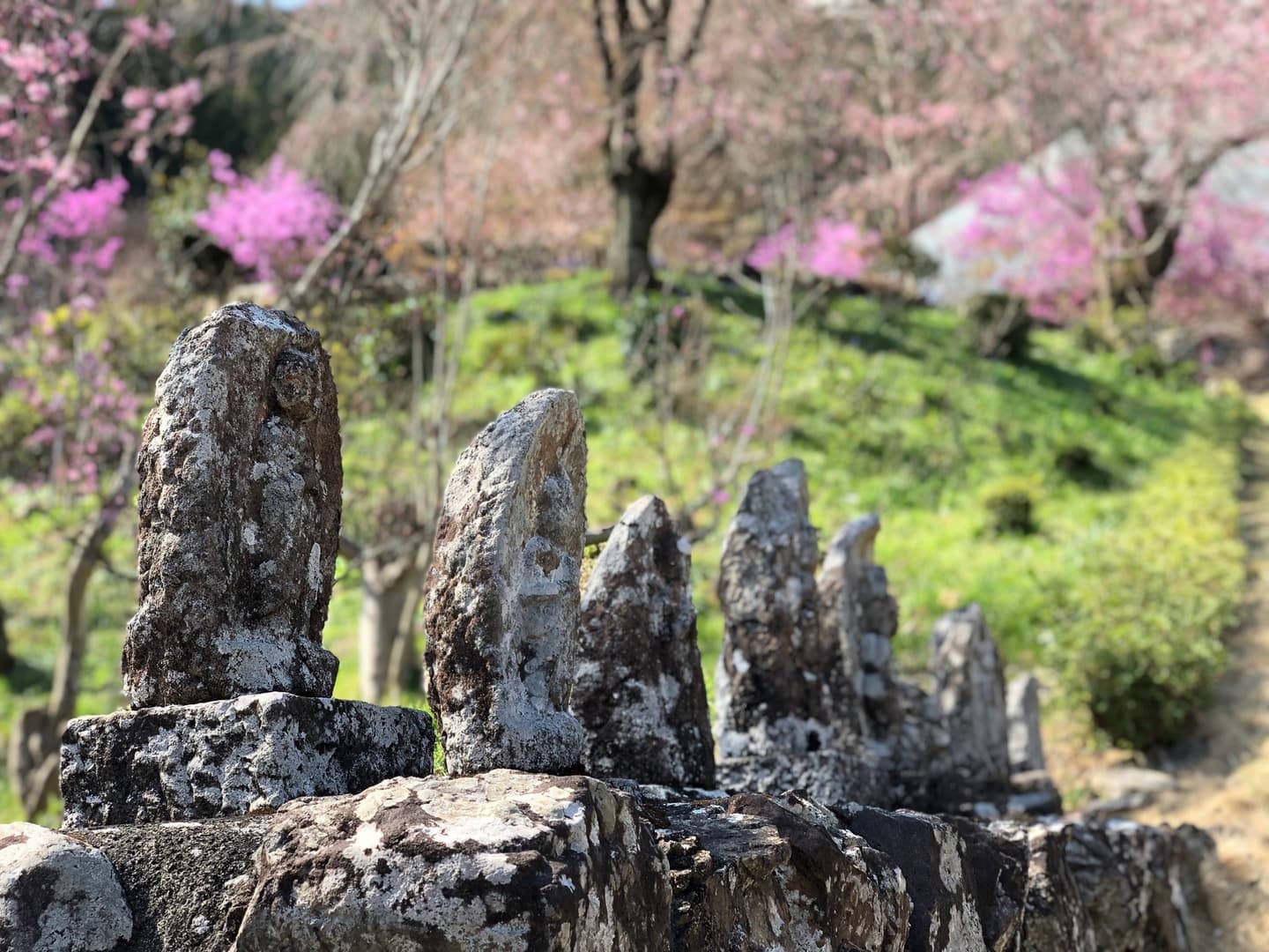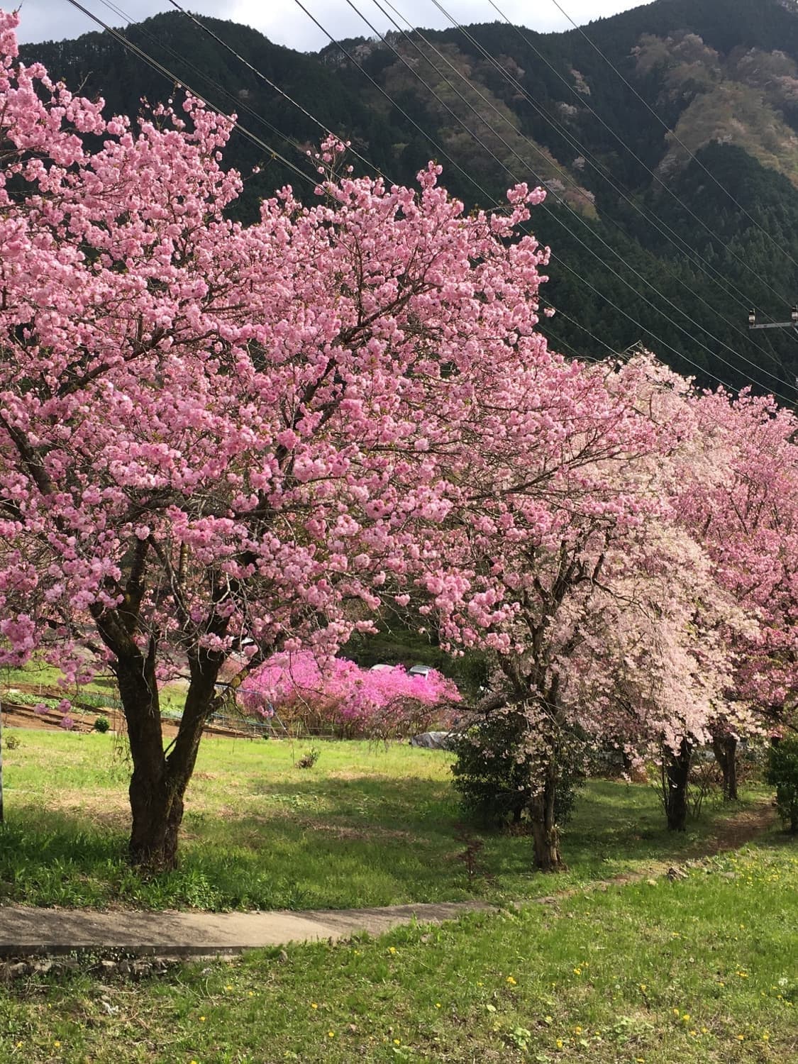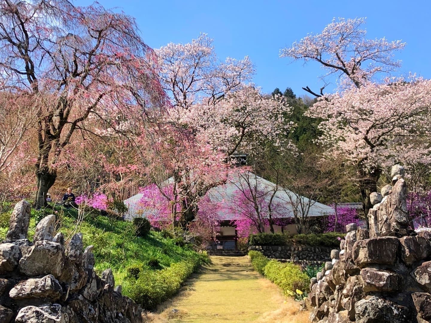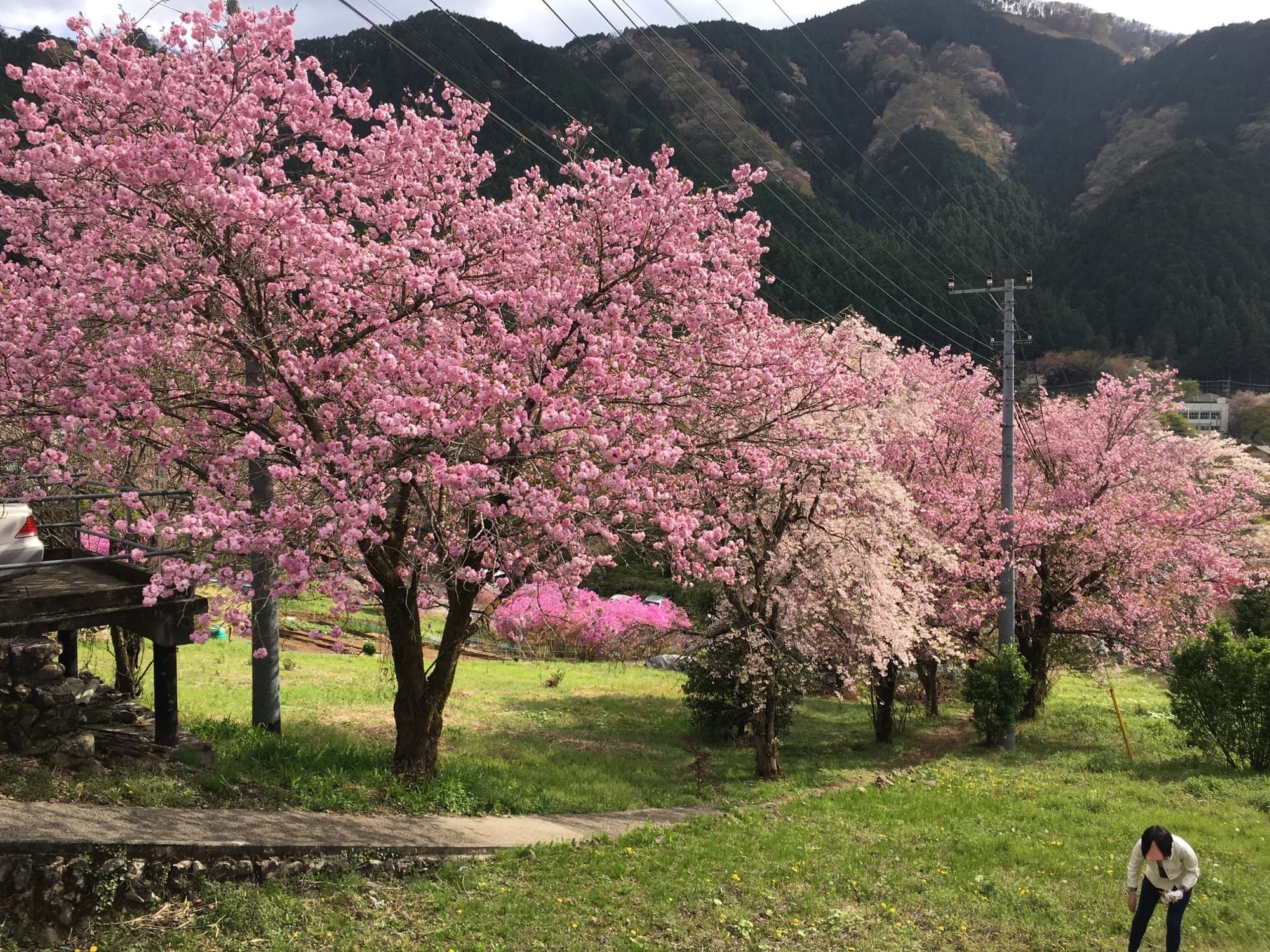 In spring, the mountains come alive with the soft pale pinks of wild cherry blossoms (Yamazakura) and the vivid pinks of azaleas (Tsutsuji), creating a breathtaking contrast against the fresh green of the valley.