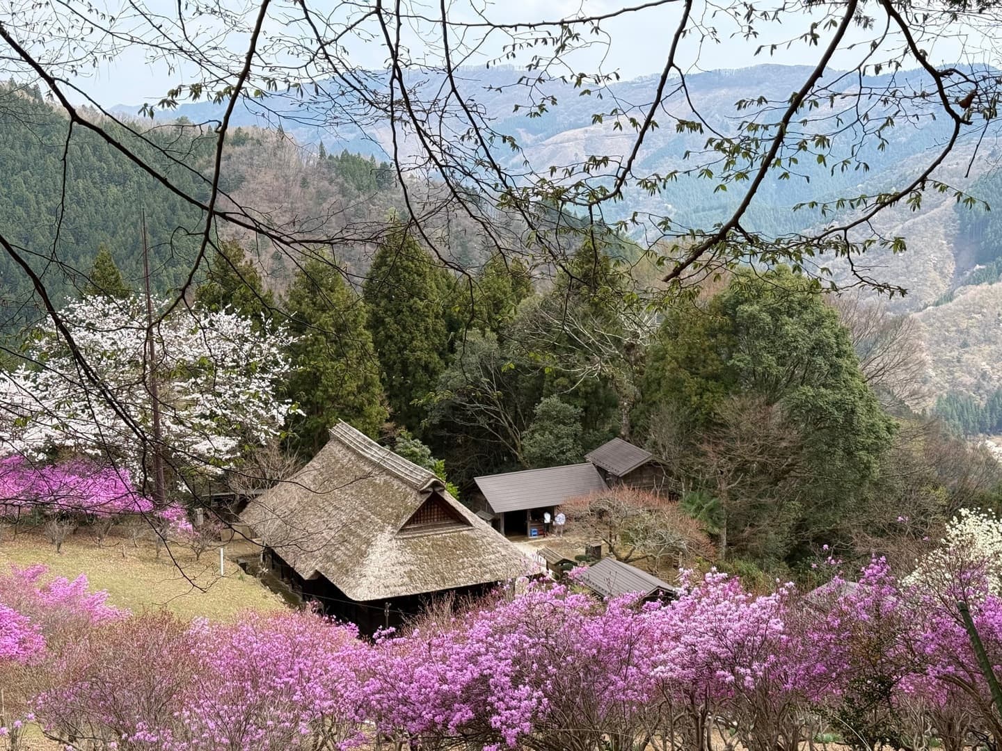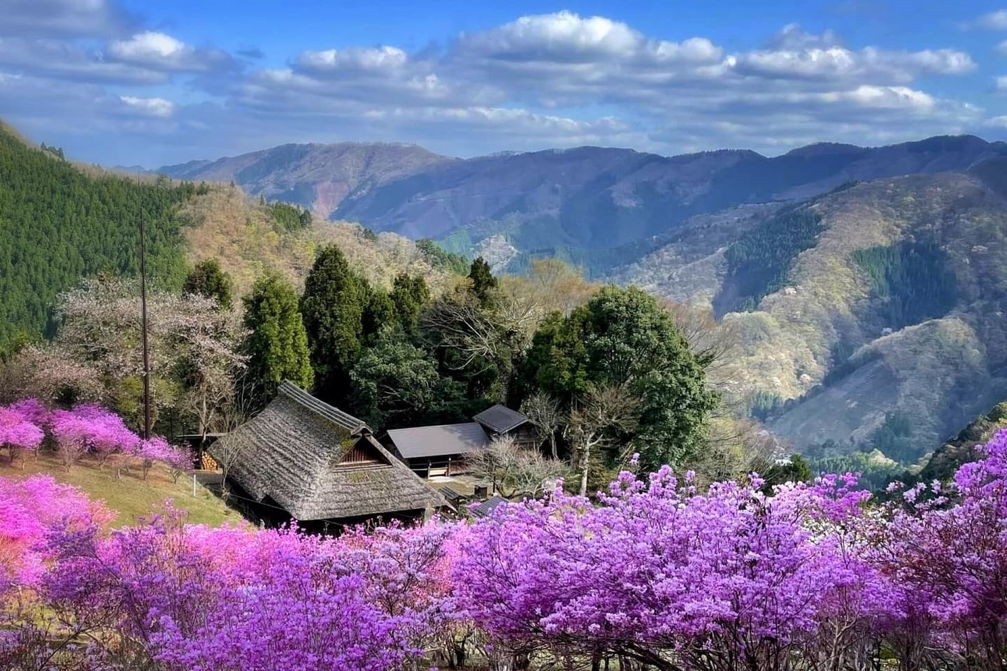 From there, you will board a mountain monorail for a steep ascent to an altitude of 750 meters.Awaiting you at the summit is the "Kobayashi House in the Sky," an Important Cultural Property from the Edo period. Here, amidst the clouds, you will find the ancient residence surrounded by a spectacular bloom of pink azaleas—a sanctuary of history and vibrant colors, far removed from the world below.